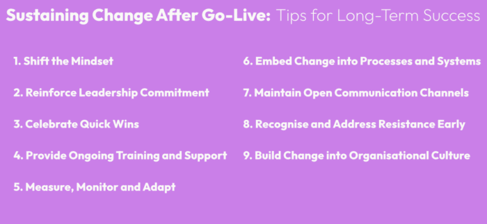 Organisations must consciously reframe how they view go-live. Instead of seeing it as the end of a project, treat it as the start of a new phase: embedding and sustaining change. This mindset shift ensures continued investment of leadership attention, resources, and communication well beyond launch.